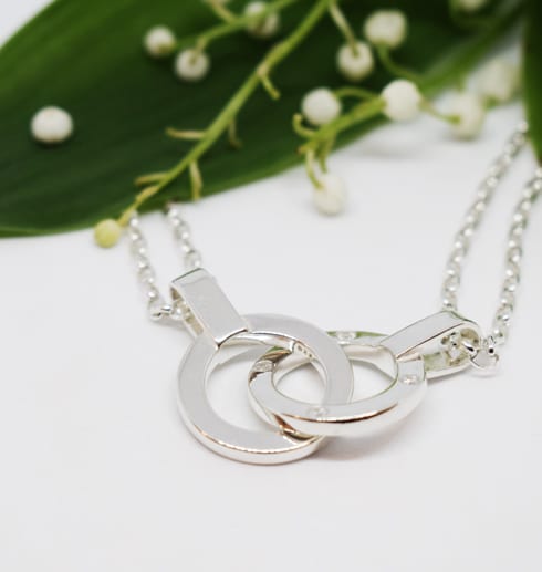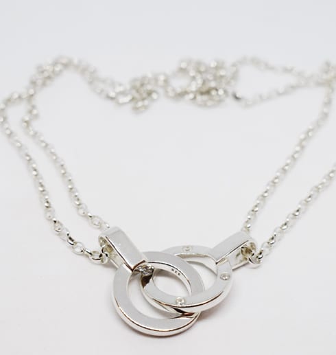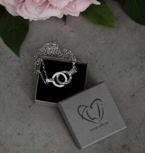 This is a magnificent, unique silver necklace with a double-layered chain. The necklace is made entirely of 925 sterling silver. The piece consists of two rings – one smooth and one with sparkling stones – different yet linked together. The idea is that differences attract and need each other. It is incredibly beautiful, sleek, and exclusive!