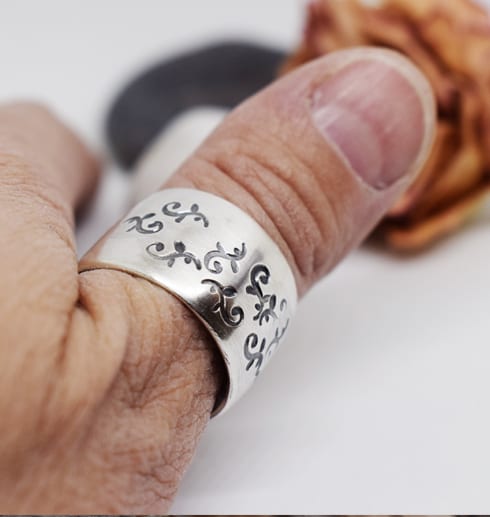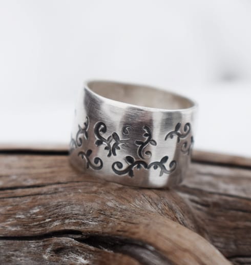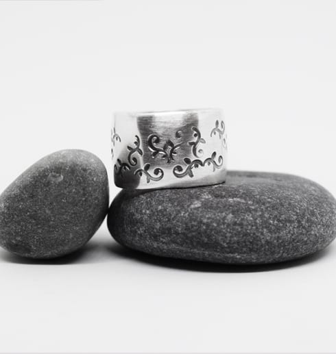 Härligt bred silverring med vackert mönster. Ringen är lite kupad och mönstret snirkligt och svartoxiderat. Detta är ett hantverk och du skriver i meddelandefältet vilken storlek du önskar på ringen.