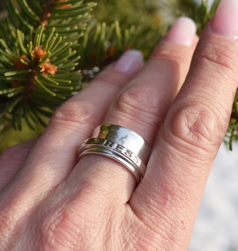 Ringen är lite konkav så ytterkanterna är vidare än mitten på ringen vilket gör att den tunna rörliga ringen inte ramlar av. På den rörliga ringen som du kan snurra på för att fokusera bättre, avleda dina tankar eller bara känna in stunden och vara i nuet, står texten ”DE-STRESS” som betyder stressa ner.