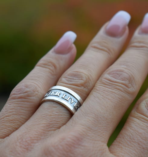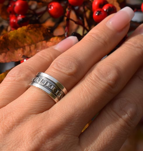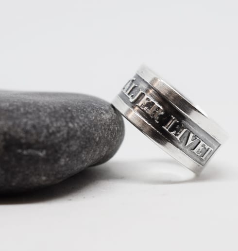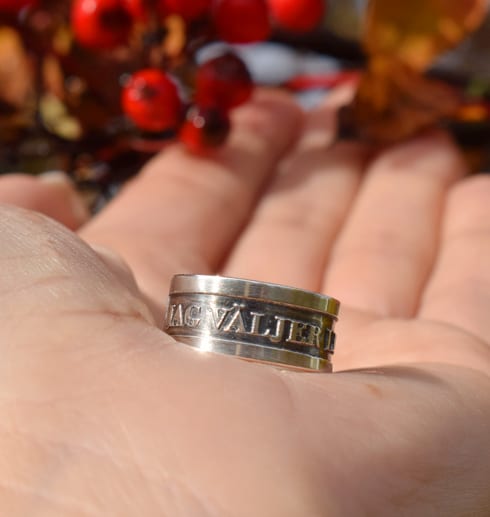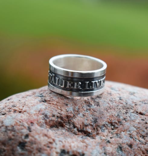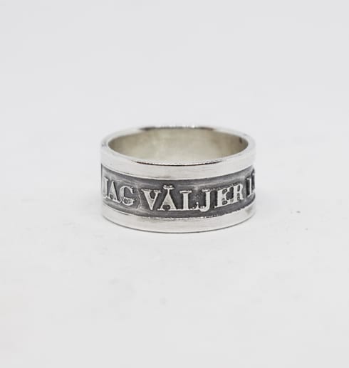 ”JAG VÄLJER LIVET” står det på denna unika ring med bakgrunden urfräst och svartoxiderad och texten upphöjd.
