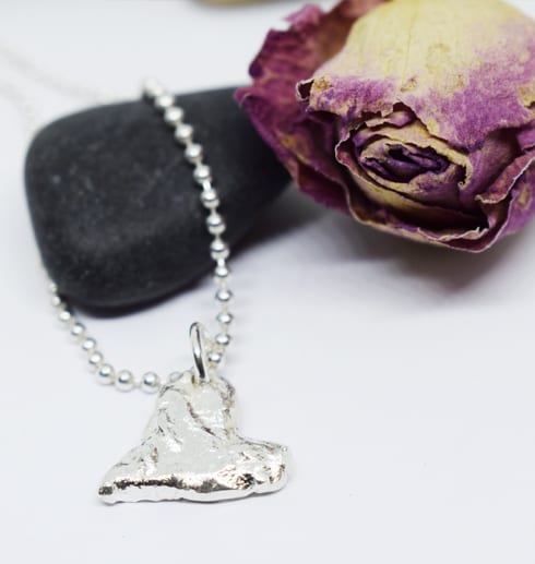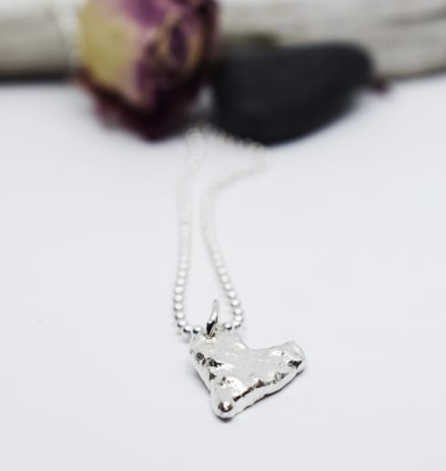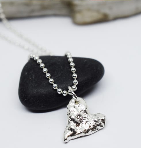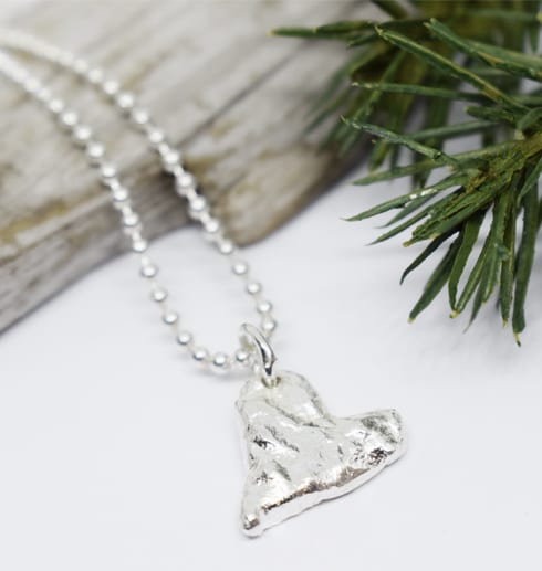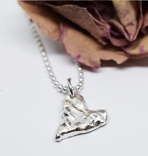 Litet massivt, unikt silverhjärta gjort i smältteknik, vilket innebär att alla blir lite olika. Vi smälter ner silverbitar som blivit över vid tillverkningen och använder en eldfast pinne att forma hjärtat med. Sedan formas hjärtat med fil, slip och puts. Hjärtat hänger i en kulkedja av silver som är 45cm lång.