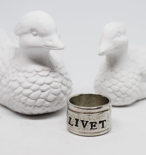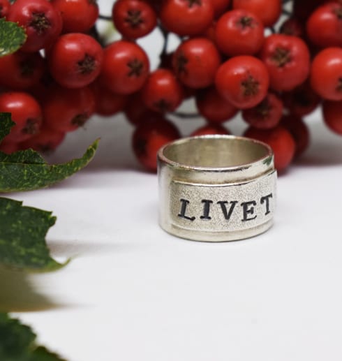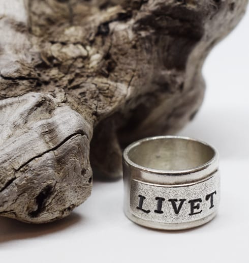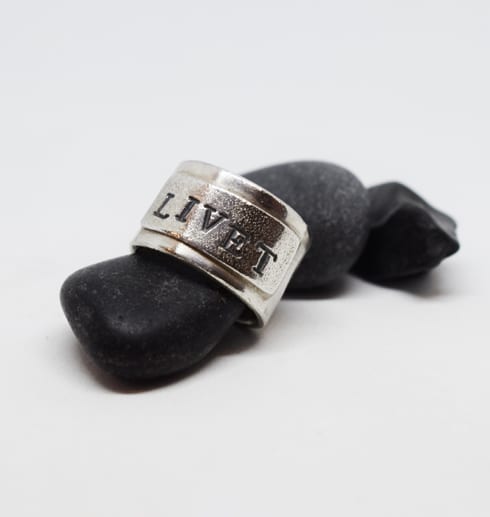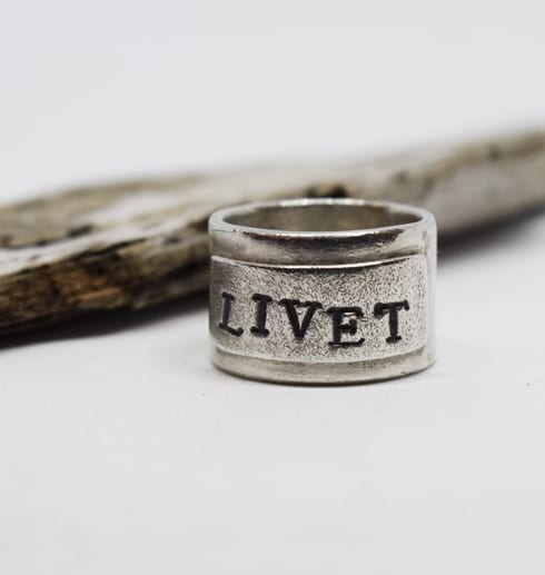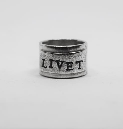 Vacker, tuff och bred handgjord silverring med fastlödd platta som har texten ”LIVET” stansat på sig. Plattan är mattslagen med en speciell borste för att få en grov, skrovlig yta som bryter av snyggt mot den blanka släta ringstommen.