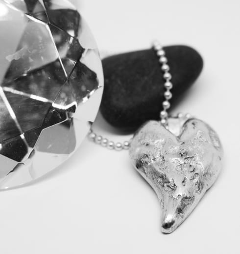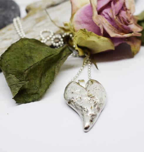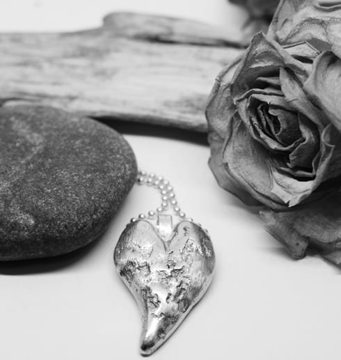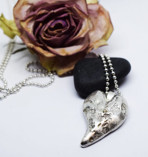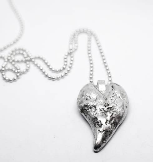 Handgjort silversmycke- ett härligt och tungt hjärta som är gjort i smältteknik. Hjärtat är gjort av överblivna silverbitar som smälts ihop och formats till ett hjärta av en värmebeständig pinne. Sedan har smycket filats, slipats och putsats så det blivit detta unika hjärta. Smycket hänger i en lång kullänk i silver.