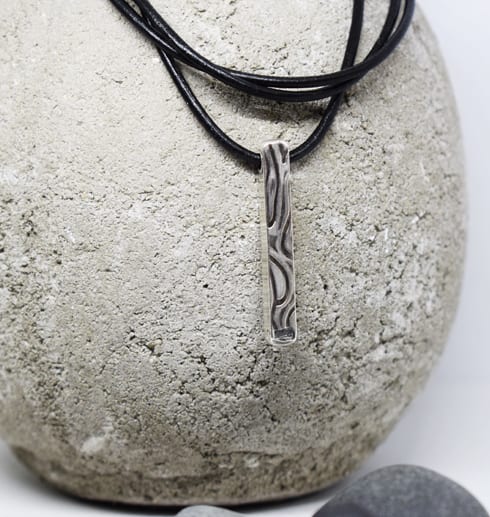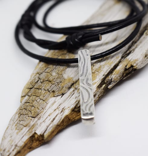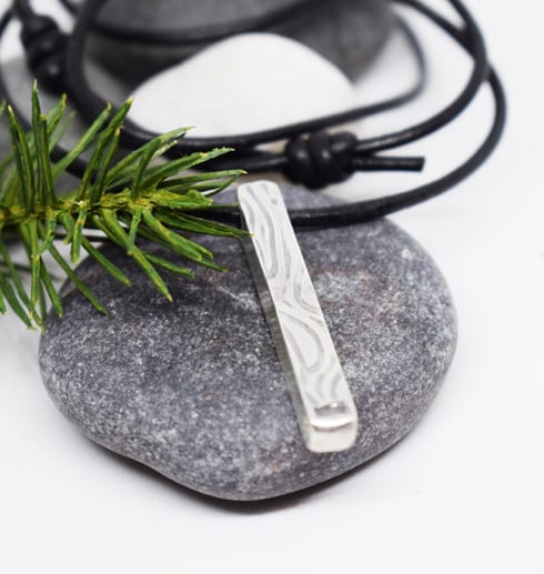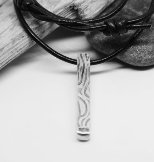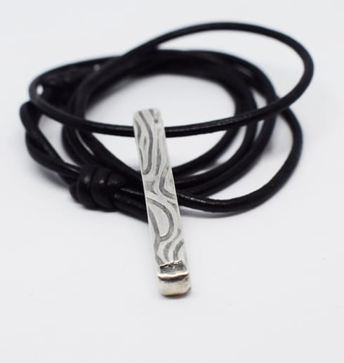 Massiv handgjord, silverstav med valsat & oxiderat mönster. Smycket har genomgående hål och hänger i en läderrem. Staven ingår i kollektionen ”Wave”. Så himla snygg till killar men även till tjejer såklart!