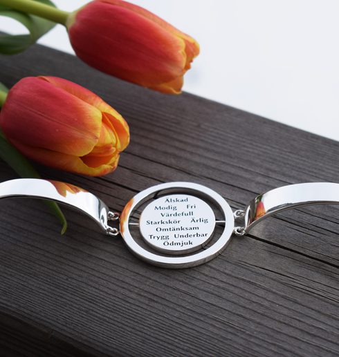 Eller så vänder/snurrar du på plattan så orden bärs inåt mot din arm och då riktas de mot dig själv. Smycket får då ett helt annat utseende med baksidan uppåt. På undersidan av den rörliga plattan är nämligen ytan lite skrovlig, robust och svartoxiderad. Ramen är högblank och mot den blir den skrovliga, svartoxiderade ytan väldigt cool, tuff och snygg!
